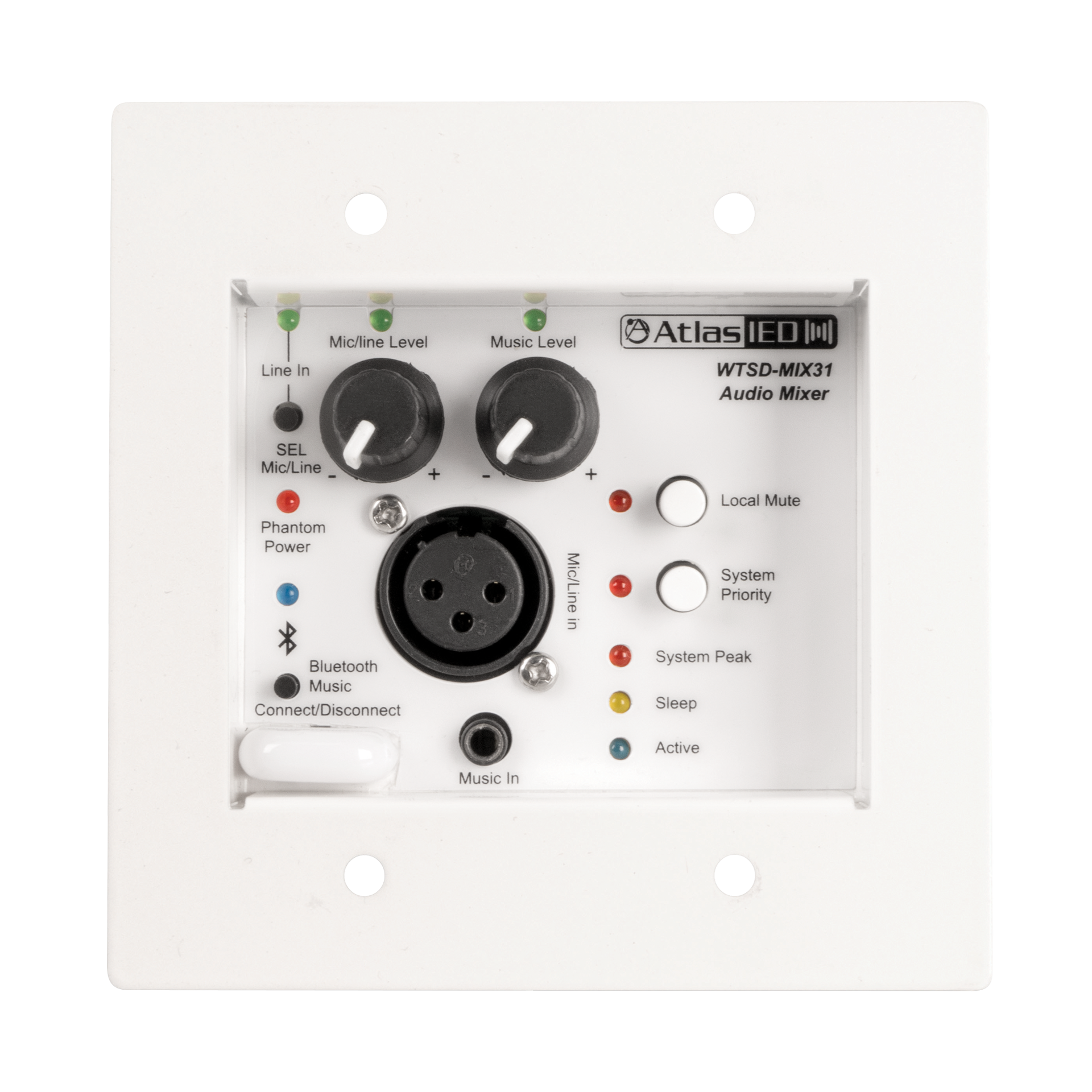 Model WTSD-MIX31K is a 3×1 Mic/line/Aux /Bluetooth Analog Mixer that features a balanced microphone/line input and an auxiliary 3.5mm and Bluetooth summed input with a balanced line output. The WTSD-MIX31K utilizes commercial grade Bluetooth technology featuring ultra-low noise levels, long range connectivity, no auto-connect and a quick disconnect bump feature. The Bluetooth Discovery ID name can be customized using the installers renaming app. Selection between mic or line level for the XLR input is done via front panel switch, accessed thru a pinhole. The high gain mic inputs incorporate user enabled phantom power for condenser microphones and a 125Hz low cut filter to eliminate unwanted low frequency interferences. A local mute button mutes output to the bus and a system priority button can mute building wide BGM systems to isolate the room. An adjustable VOX feature allows for AUX input background audio to be muted when announcing is present. The AUX input is a stereo 3.5mm jack and is electronically summed to achieve the best audio performance. Separate level controls for each input provide control for the audio mix needed.