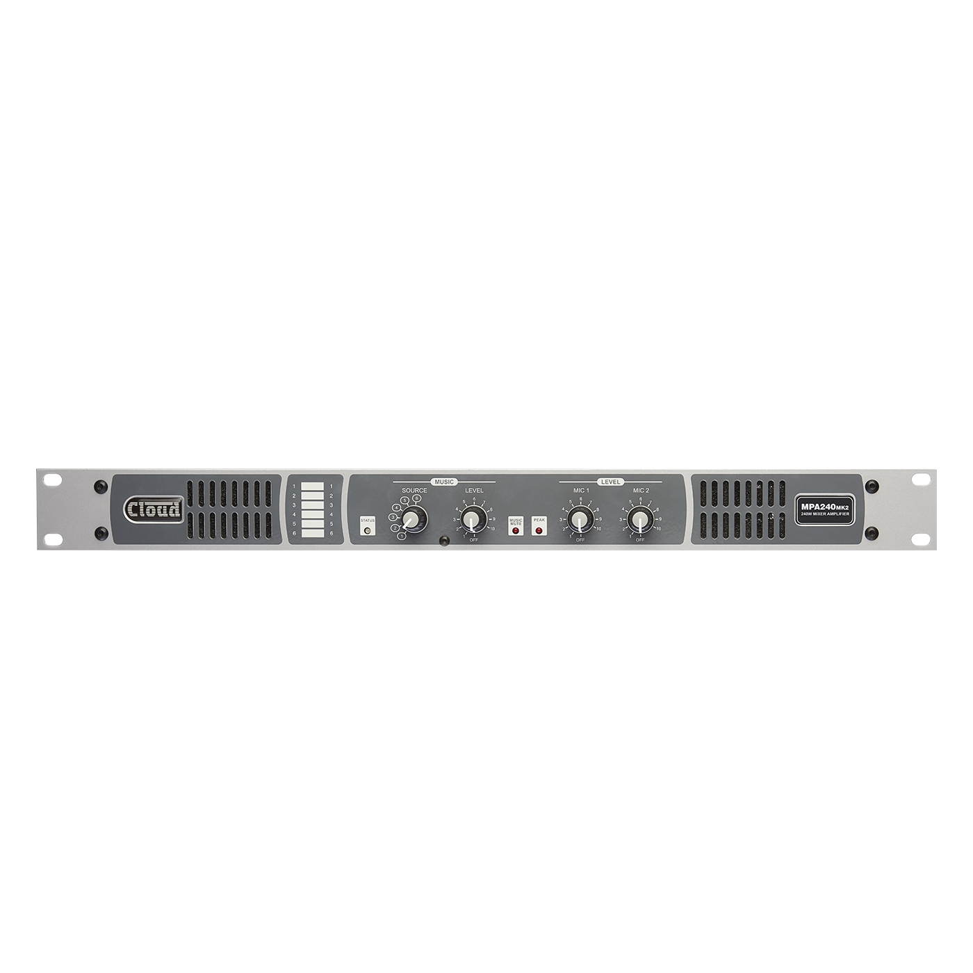 The Cloud MPA240MK2 is world-class premium 240W integrated Mixer Amplifier which provides a complete audio solution for Houses of Worship, retail outlets, hotels, licensed premises and other spaces where music, announcements and/or flexible paging are required. It combines the functions of a two-channel microphone mixer with full paging facilities, a six-input music source selector and a mono power amplifier in a single compact 1U unit.