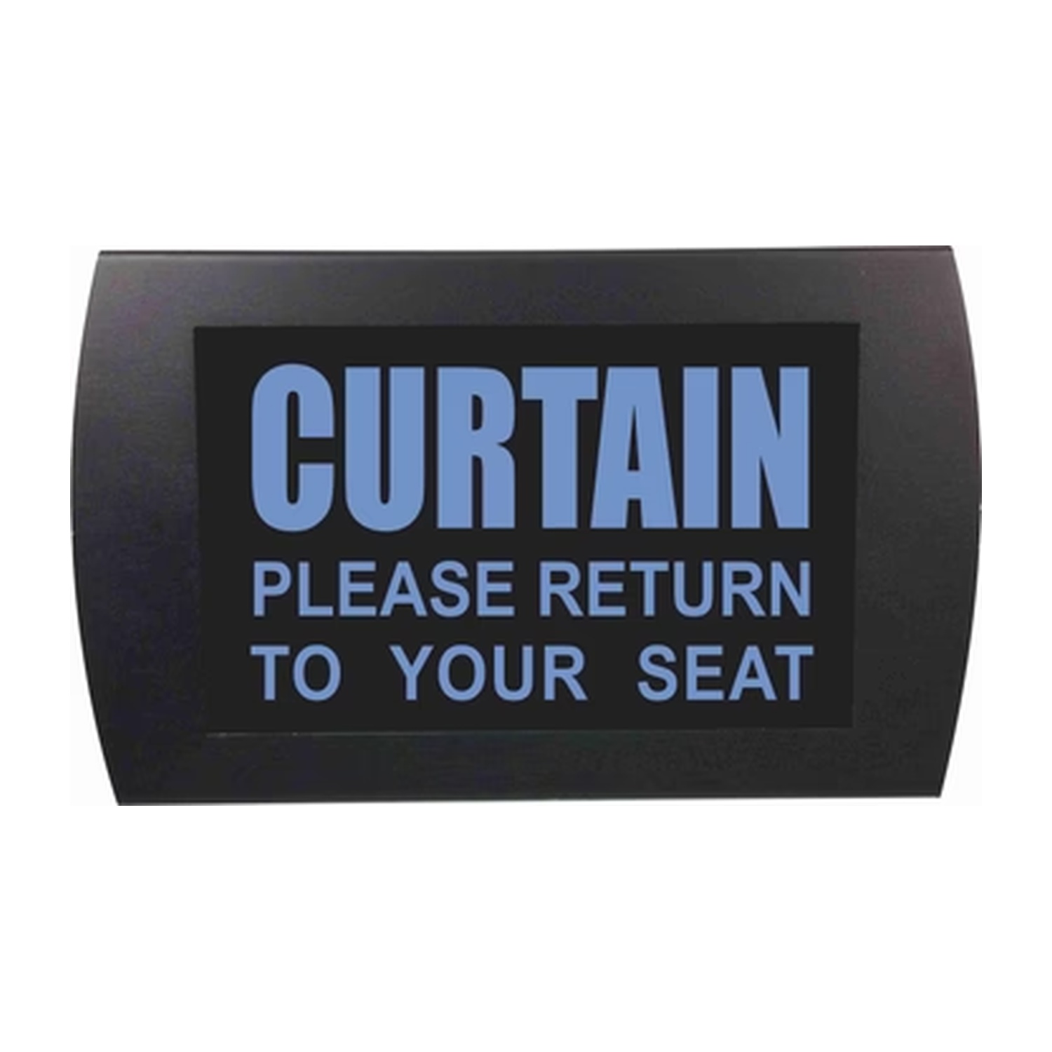 LED “Curtain – Please Return to Your Seat” illuminated sign with blue lighting. Includes power supply, 25-ft extension cable, and mounting hardware. Ideal for theaters, auditoriums, and performance venues.