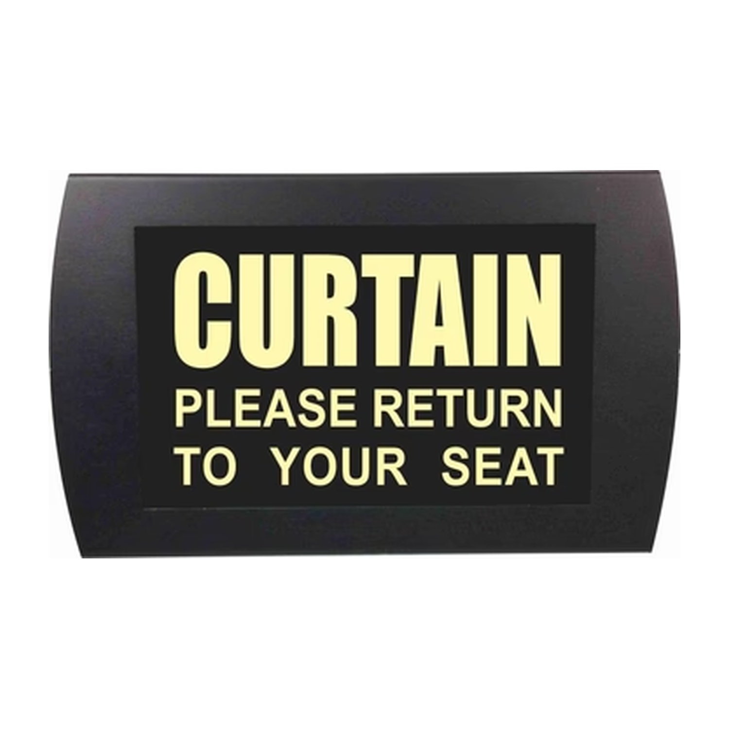 LED “Curtain – Please Return to Your Seat” illuminated sign with yellow lighting. Includes power supply, 25-ft extension cable, and mounting hardware. Designed for theaters, stages, and live performance environments.