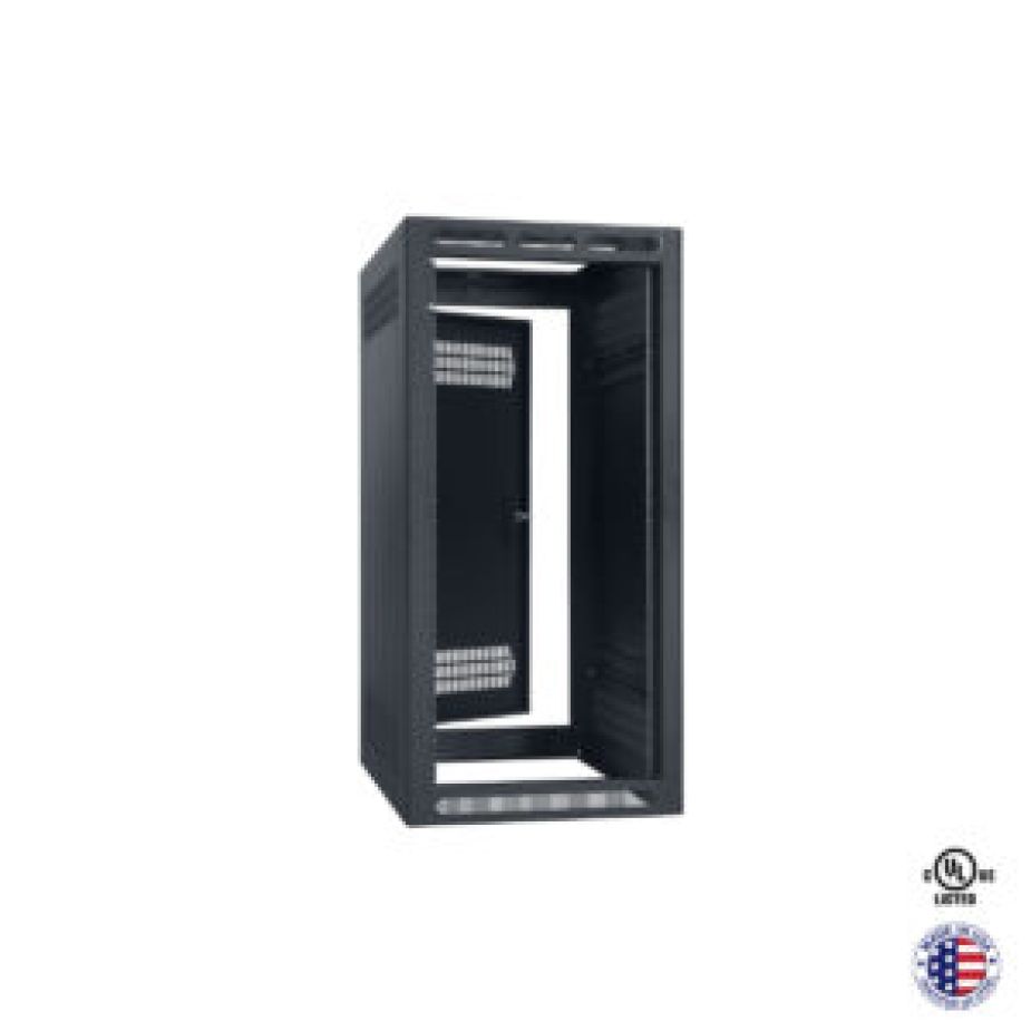 The LER Series 19-inch standalone AV equipment rack is fully-welded USA-certified steel, reinforced at load-bearing junctions for robust support. Welded side panels feature upper and lower vents for passive ventilation. The rack includes adjustable mounting rails that can be repositioned deeper into the rack as needed to accommodate equipment controls. Beveled corners. Black-textured powder-coat finish. Rack includes rear door with keyed lock. An optional front door is available separately (LFD Series).