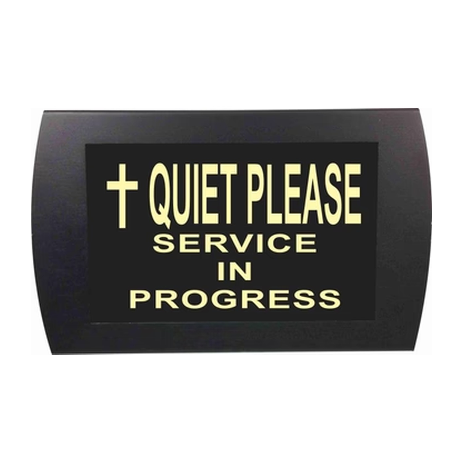 LED “Quiet Please Service in Progress” sign featuring a cross symbol with yellow illumination. Includes power supply, 25-ft extension cable, and mounting hardware. Ideal for churches, worship centers, chapels, and religious facilities.
